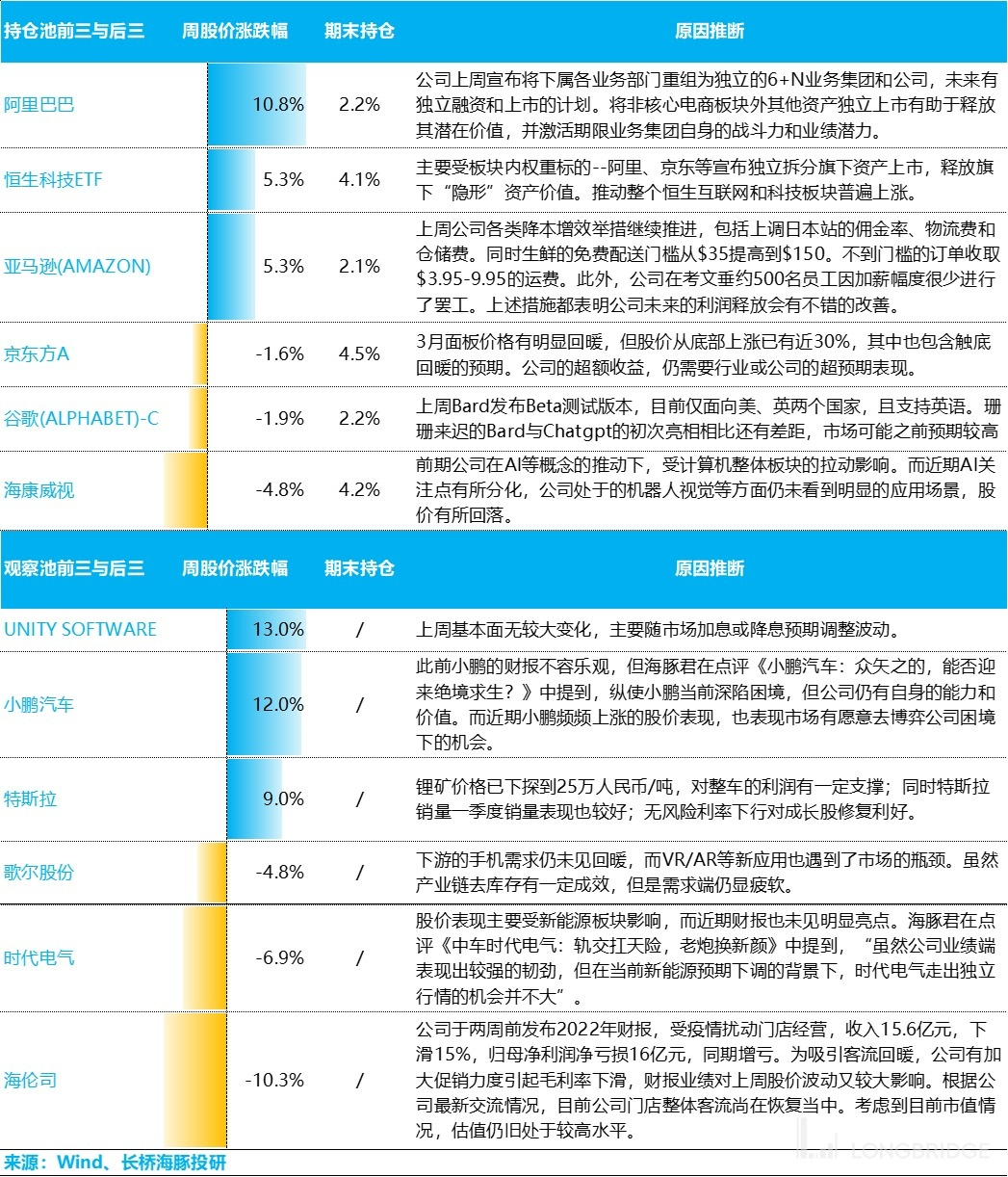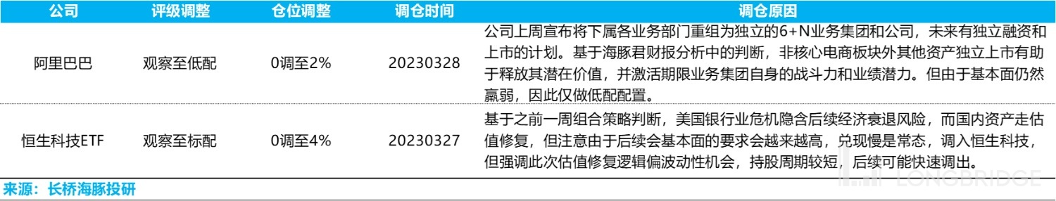 3)因此整體上海豚君仍然保持了相對高的空倉,權益類資產佔比不到 60%,上週主要是在阿里宣佈組織調整的當天調入以低配調入阿里,同時基於之前一週策略週報中對於港股估值修復的判斷,調入了恒生科技指數,但中國資產基本面修復較慢的情況下,整體動作偏短期,後續持倉時間可能會很快調出。