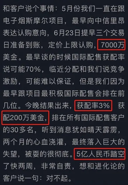 有些人對國配好像有些執念,但在執行的角度看,這東西就是坑,説是説有貨,實際上全看關係,然後不同的票關係程度不一樣拿到的貨還不一樣,香港其實還是比較講究人情關係的,國配的暗箱操作本來就很多,裏面關係户一堆抽屜協議啥的,如果是沒有啥關係的話,確實沒戲,完全不像大家想象的那樣美好。