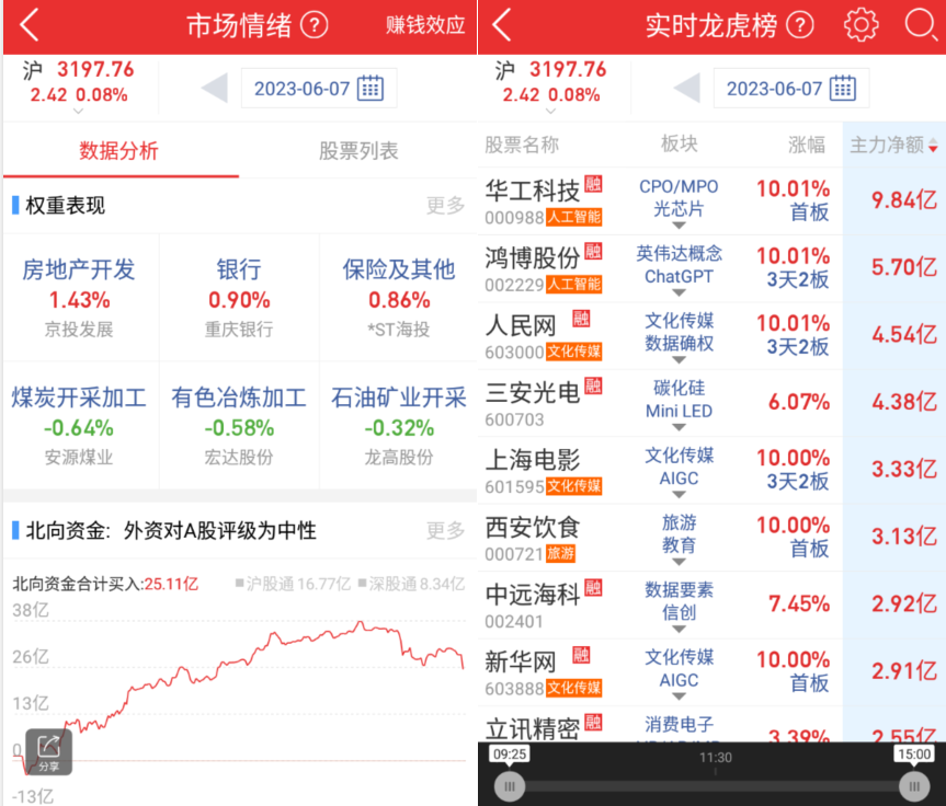 大盤在水面附近反覆震盪小幅收紅,創業板指跌超 1.6% 再創年內新低。總成交額縮量超 13% 回到 8100 億,上漲家數超 2600+,市場情緒有所回暖。同時北向資金淨流入 25.1 億,盤面呈現震盪整理態勢,賺錢效應集中於人工智能、文化傳媒、VR/AR/MR方向。