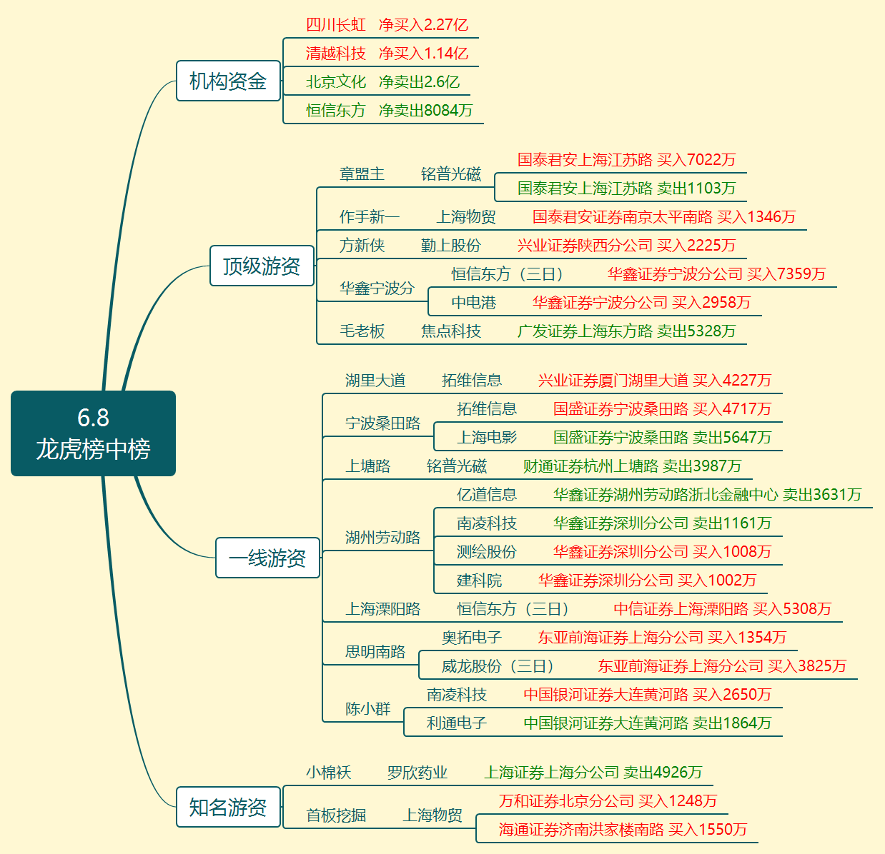 机构买入四川长虹、清越科技,卖出北京文化、恒信东方;章盟主做t铭普光磁;作手新一买入上海物贸;方新侠买入勤上股份;华鑫宁波分买入恒信东方(三日)、中电港;毛老板卖出焦点科技;湖里大道买入拓维信息;宁波桑田路买入拓维信息,卖出上海电影;上塘路卖出铭普光磁;湖州劳动路买入测绘股份、建科院,卖出南凌科技、亿道信息;上海溧阳路买入恒信东方(三日);思明南路买入奥拓电子、威龙股份(三日);陈小群买入南凌科技,卖出利通电子;继续轮动,等待指数选择方向 。
