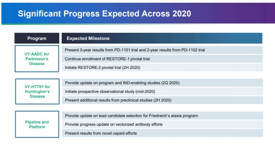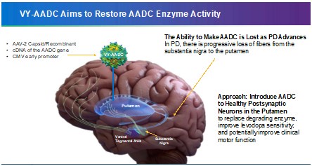 基因治療產品 VY-AADC01 是一種腺相關病毒(AAV),攜帶芳香 L-氨基酸脱羧酶(AADC)的 cDNA 序列。在 Clearpoint MRI 神經系統的導航下微創把 VY-AADC01 注入大腦殼核,替換被降解的芳香 L-氨基酸脱羧酶,以提高神經元對 L-Dopa 的敏感度,進而增加多巴胺的分泌。