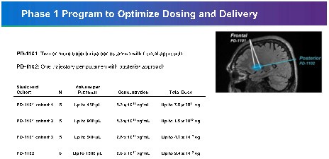 - 隊列 3:在大腦兩側的殼核每側最大注射 900 微升,但濃度比隊列 2 高 3 倍,最高達 4.5×1012 vg。