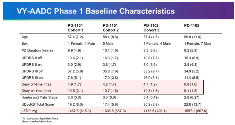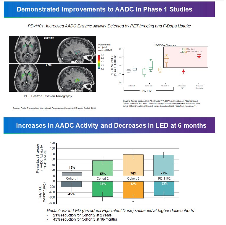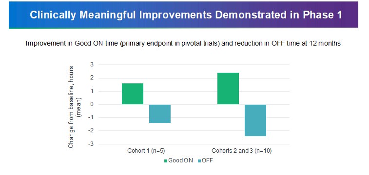 使用 VY-AADC 治療 12 個月,提高了平均無運動障礙時間(+1.7 小時),達到 12.2 小時;減少了運動障礙時間(-2.2 小時),為 2.4 小時。有明顯的劑量效應。