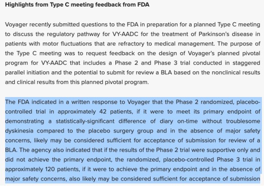 依據 FDA 和 VYGR 在 2018 年的交流,FDA 表示如果隨機、安慰劑對照的臨牀二期試驗(約 42 名參與者)達到其主要終點(與安慰劑組相比,on-time 有顯著性提高),VYGR 可以提交 BLA(生物製品許可證申請)。