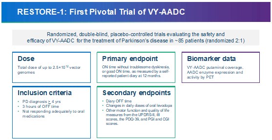 臨牀的主要終點是 VY-AADC 的安全性、耐受性以及劑量反應,通過不良事件的數量來衡量。次要終點是使用腦成像法(18F-FDOPA PET),以衡量左旋多巴轉化為多巴胺的情況。
