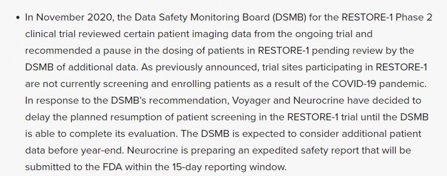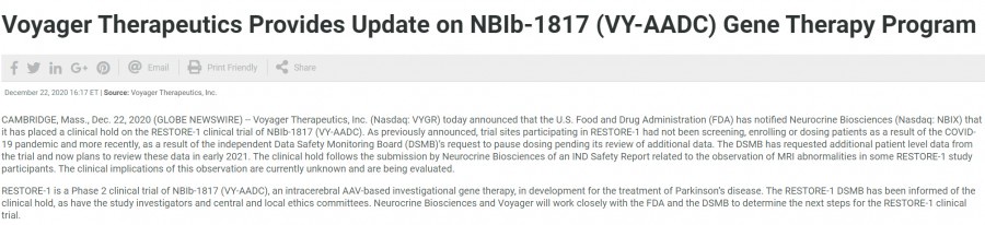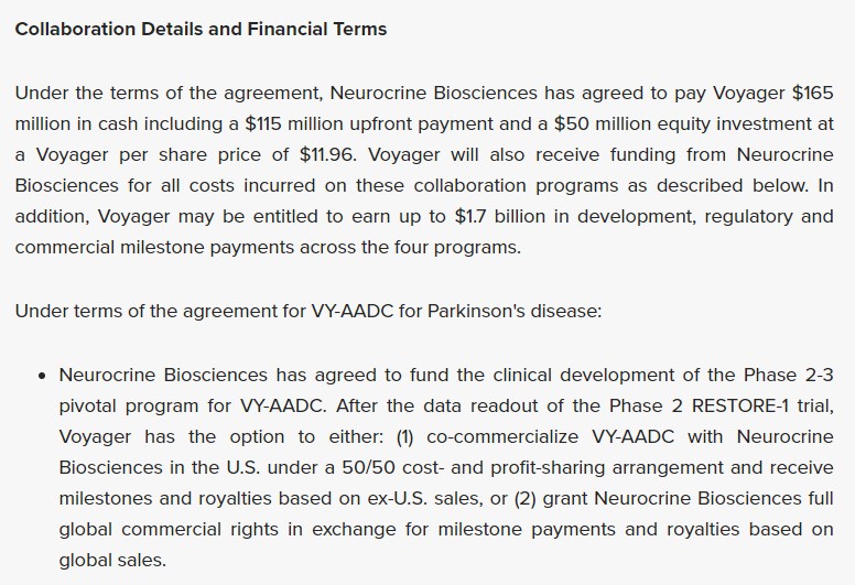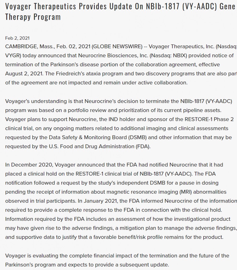 VYGR-公司今天公佈了更多不好的消息,NBIX 退出了跟 VYGR 合作的帕金森基因治療項目。目前來看 VYGR 公司管線問題多多,除非極度低估(跌到現金價附近),否則不建議配置了。