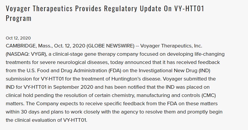 VYGR 盤後宣佈 FDA 叫停了公司藥物 VY-HTT01 的 IND 申請,公司需要解決一些 CMC 方面的問題。VYGR 連 IND 都通不過(這應該是新藥申請中最簡單的一步)一方面説明公司在 CMC 方面可能存在一些問題,另外一方面也説明了現在 FDA 對基因治療的態度。我們暫時不建議配置基因治療領域的股票,也不建議隨便抄底 VYGR.
