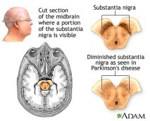 圖一:右上,正常人大腦切片,黑色部分為黑質,黑色來自包含多巴胺的細胞;右下,帕金森症患者的大腦中黑質缺失。來源:https://medlineplus.gov/ency/imagepages/19515.htm