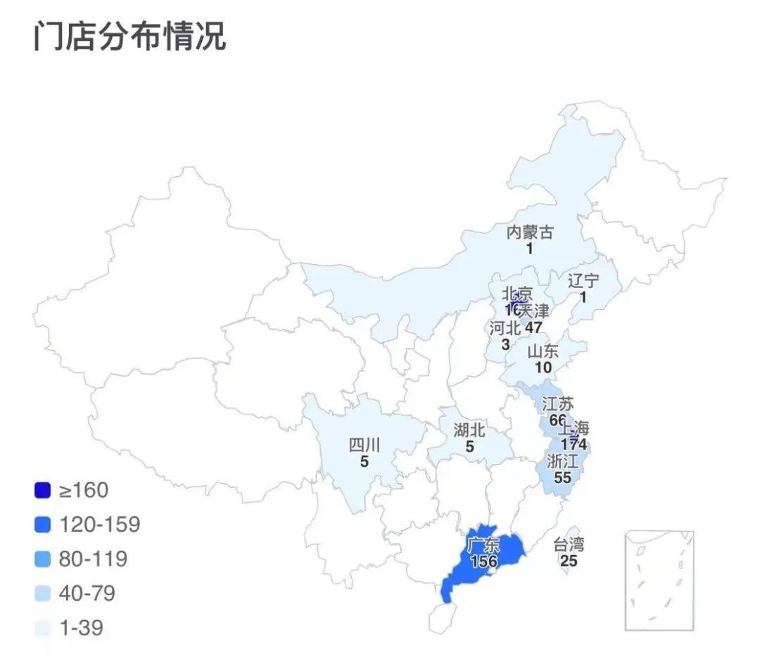 從達美樂的門店分佈情況來看,廣東門店數最多,其次是北京、天津,再是江浙滬門店數最多,近兩年達美樂加速了在北京上海之外的佈局,但整片地圖上,空白地帶仍佔據大半。