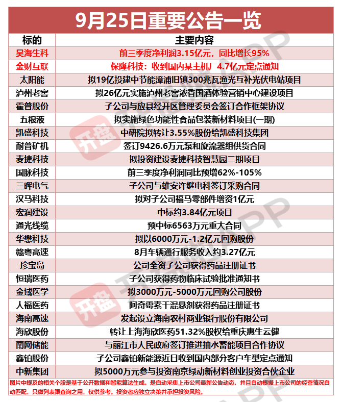 1、昊海生科:前三季度淨利潤 3.15 億元,同比預增 95%。